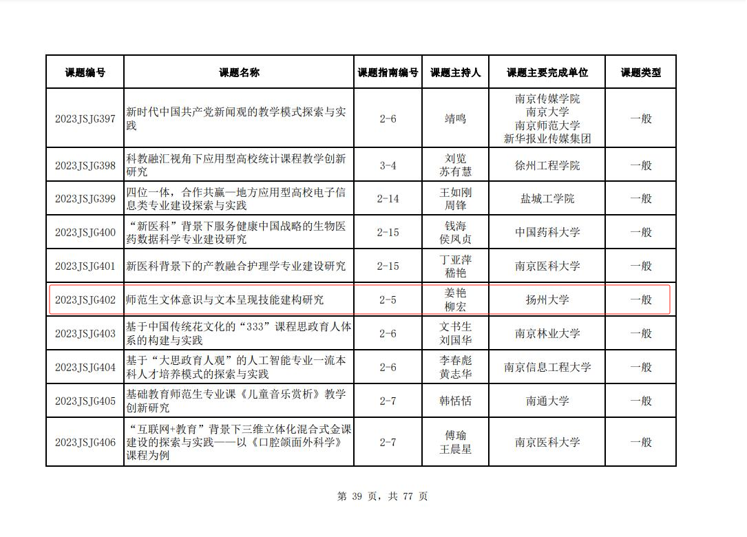近日,江苏省高等教育学会发布《关于公布2023年江苏省高等教育教改研究立项课题评选结果的通知》,我院姜艳、柳宏老师的课题《师范生文体意识与文本呈现技能建构研究》获批立项。