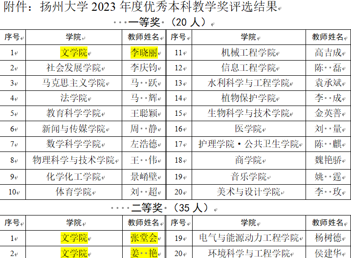 本次评选,经教师申报、学院审核推荐、专家评审、校本科教学指导委员会审定,确定55名教师获评扬州大学优秀本科教学奖,其中一等奖20名,二等奖35名。