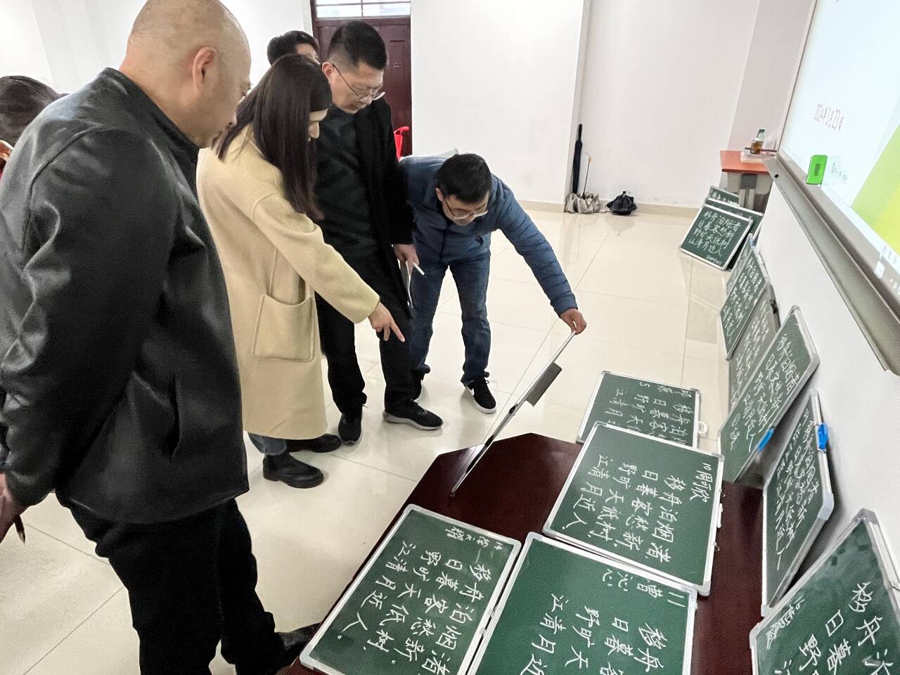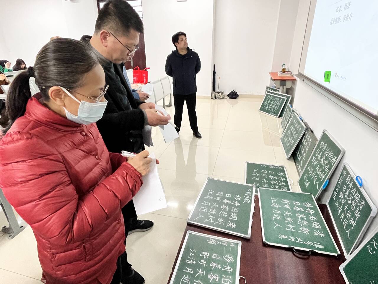 本次比赛特邀了4位中学一线的省特级教师、正高级教师以及扬州市语文学科带头人担任评委,分别为扬州中学于扬老师、扬大附中陈中老师、邗江中学李艳老师、邗江一中唐振兴老师。担任评委的还有我院汉语言文学专业主任张立兵老师。评委们先对15位选手的钢笔字和粉笔字书写进行品评并打分。
