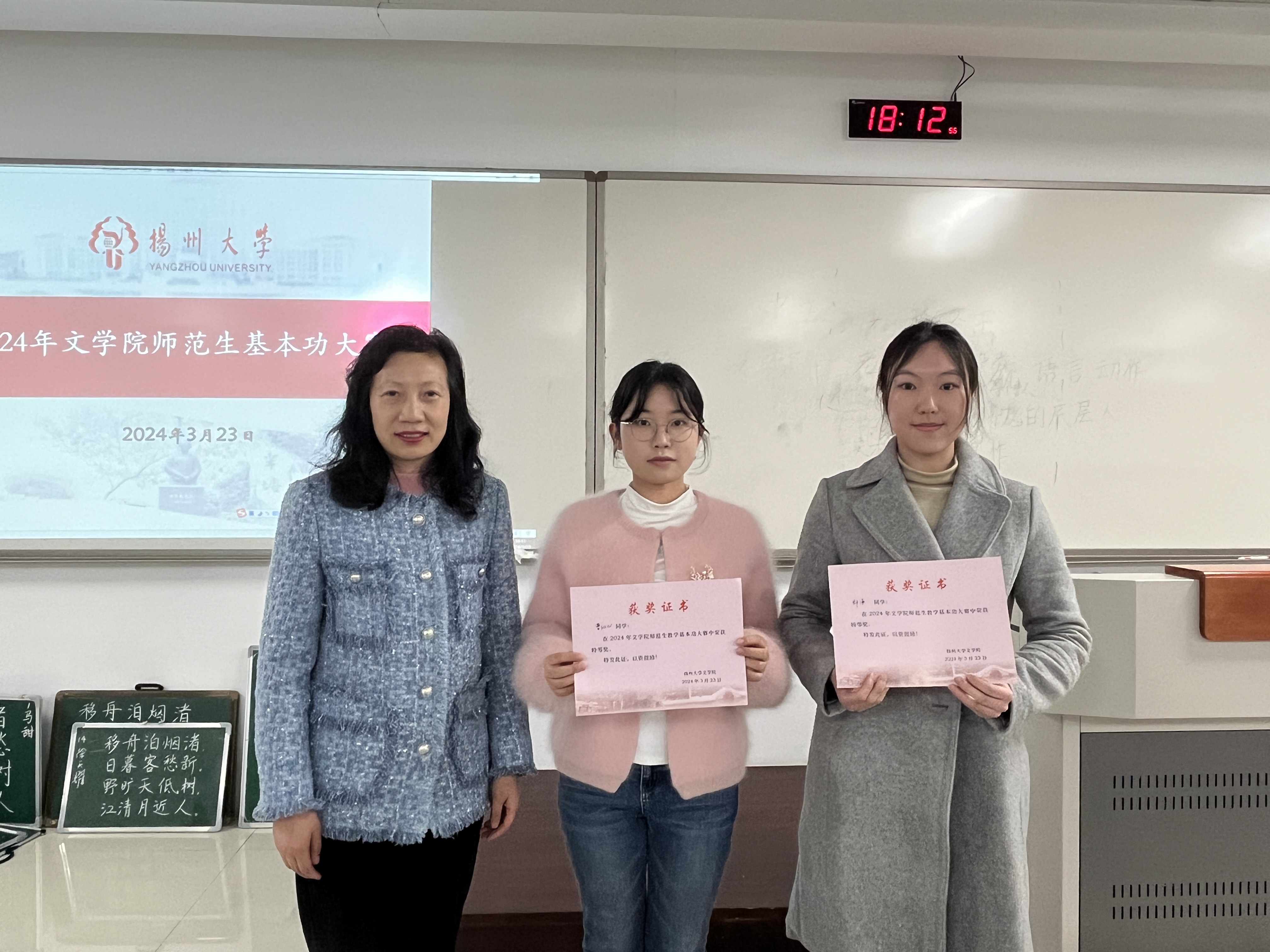 选手模拟授课结束后,王逊副院长当场宣布本次比赛的特等奖、一等奖、二等奖、三等奖和单项奖,并举行颁奖仪式。本次比赛邀请了扬州大学教务处副处长俞福丽到场担任颁奖嘉宾。