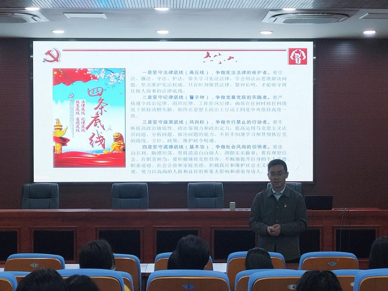 张彦主任围绕三大方面展开具体讲解重点强调,青年党员一要明底线知敬畏,提高党性觉悟;二要承先贤传校训,涵养廉洁文化;三要守初心担使命,坚定理想信念。同时,建议广大青年要厚植家国情怀、涵养进取品格,追求健康生活,提升文学素养,以奋斗姿态激扬青春,不负时代,不负华年。