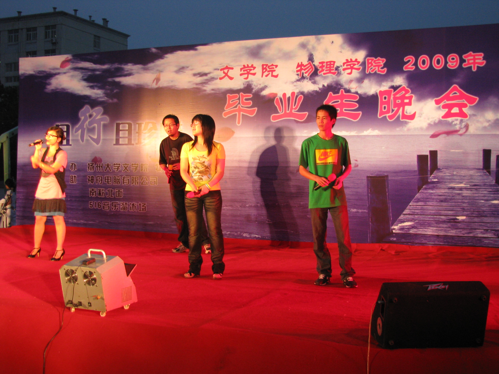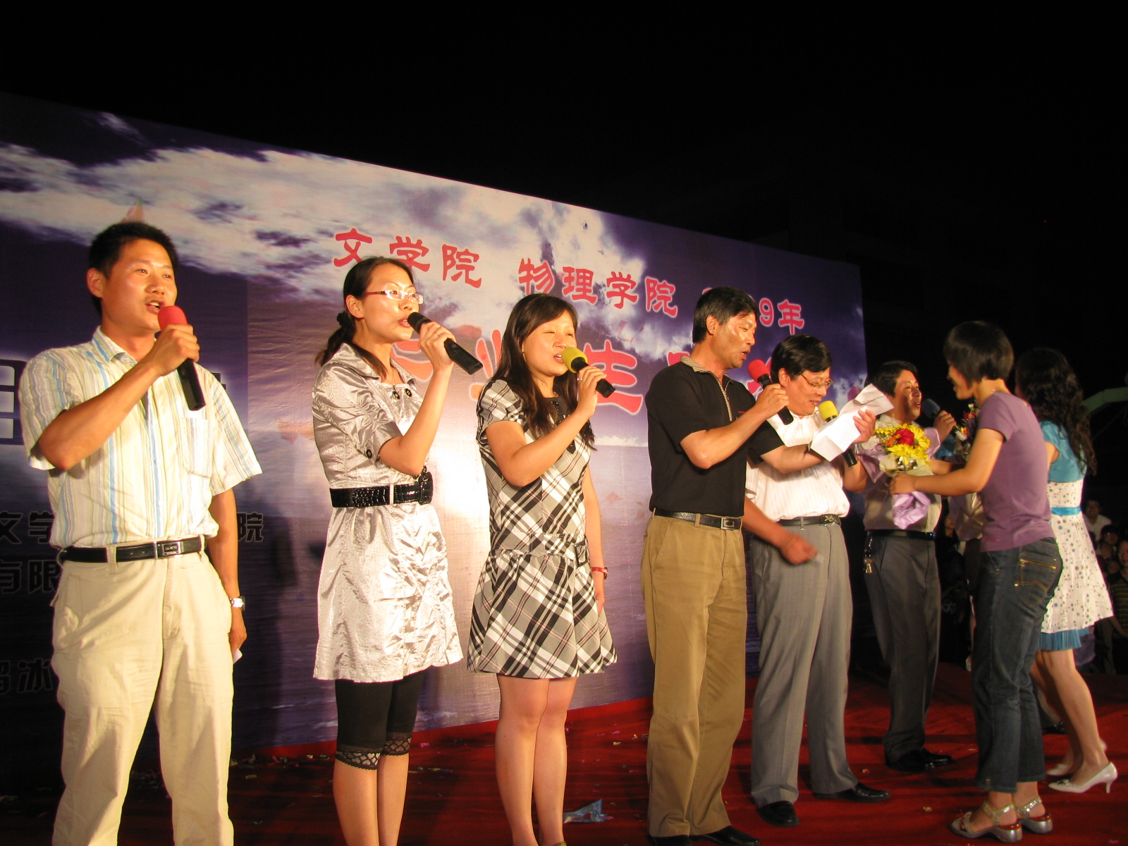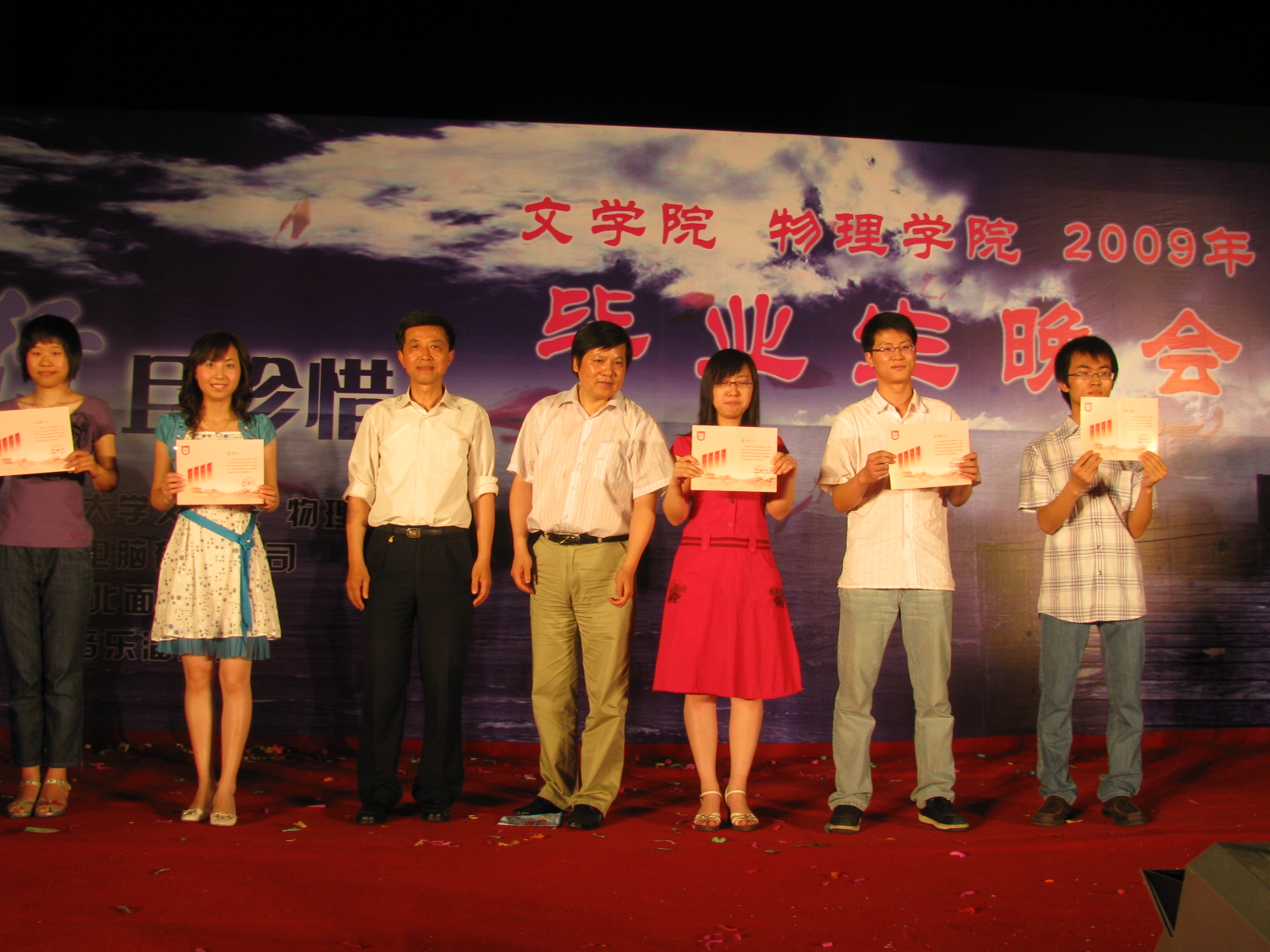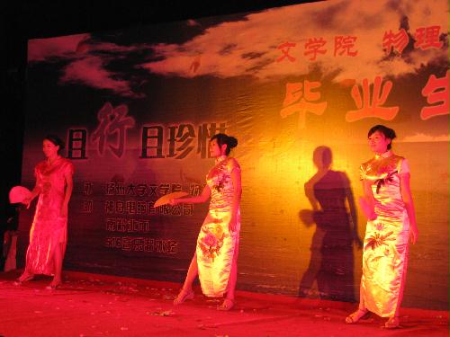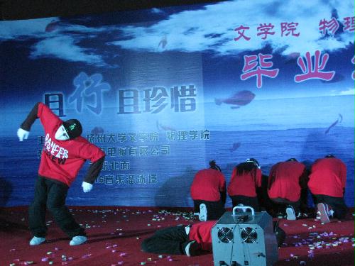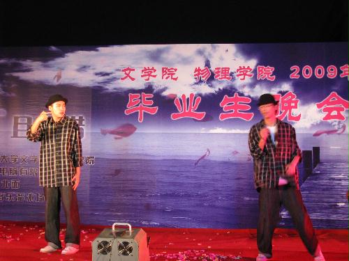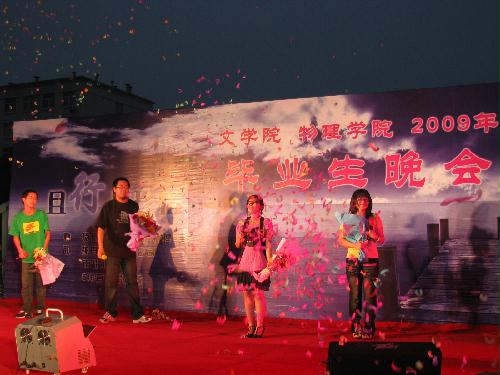 且行且珍惜•扬州大学2009届文学院联合物理学院毕业生晚会华丽上演 6月10日晚,由我校文学院与物理学院联合举办的“且行且珍惜”2009年毕业生晚会在瘦西湖校区篮球场隆重举行。校团委、文学院和物理学院相关领导、两院09届毕业生参与并观看了晚会。