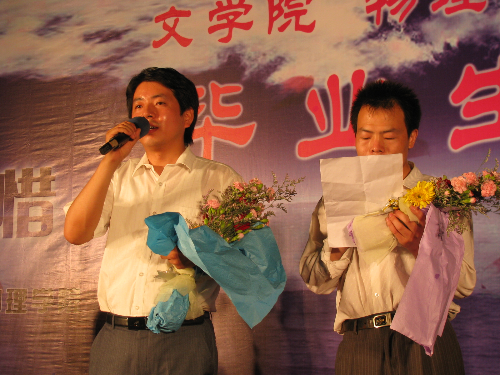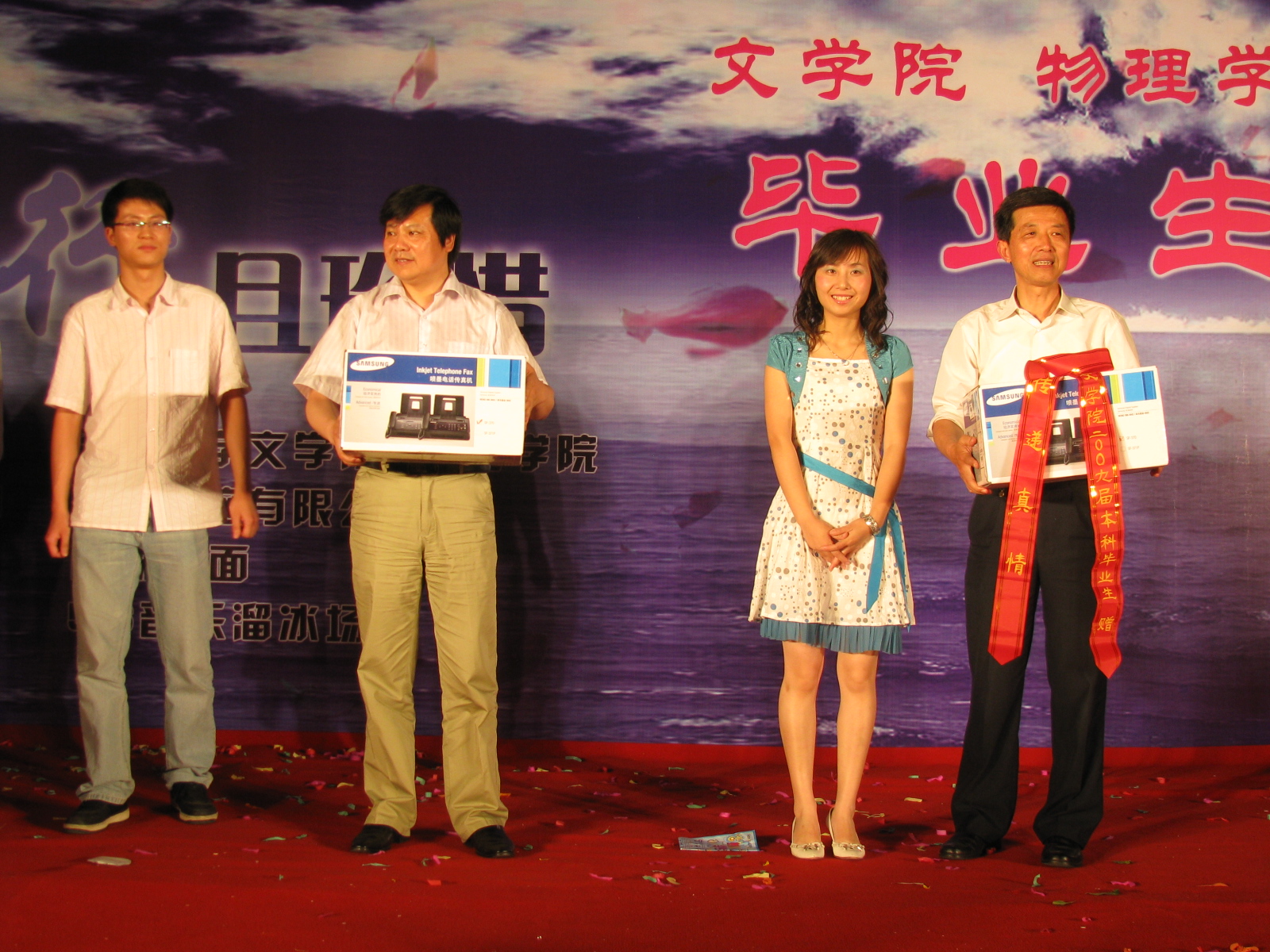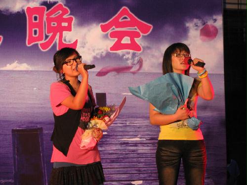 在晚会接近尾声时,两院领导与毕业生们一同合唱的《永远是朋友》将整场晚会推向了高潮,舞台上下充满了浓浓的师生之情。歌曲结束后,两院毕业生代表向母院赠送了两台传真机,寓意“传递真情”,表达了全体毕业生对母院精心栽培的真挚感谢。