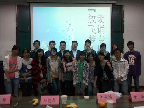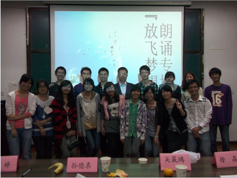 2012年读书者协会和飞天文学社一起合办的主题为“放飞梦想”的朗诵活动在团委报告厅举行。活动中,我们有意让部分社员参与活动的策划,让它们得到了锻炼。活动我们邀请到了孙得喜老师、许婷老师、黄伟学长和吴晨鸿、安生副主席出席活动,活动氛围较为热烈,列席老师和学长对同学们的表演进行了精彩的点评。