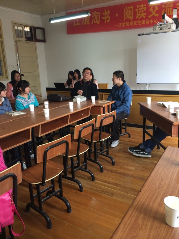图正中坐着的是文院“男神”苏保华老师,右三站着的是本次书友会主持人秦力。