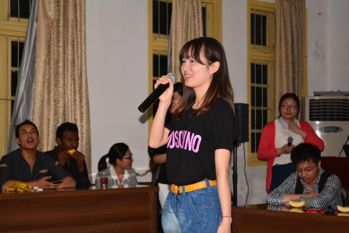 活动开始,汉语班同学黎智慧以一首《朋友》热场,来自尼泊尔的苏磊与黎智慧同学深情合唱带动现场留学生与同学们的集体大合唱。接下来,周丹妮同学的一首《七里香》和张楠同学的《红颜劫》唱出了中国歌曲的特有韵味。在欢乐的气氛下,留学生黑龙唱了一首中国歌曲《因为爱情》,获得了大家的赞赏。随后,来自美国、比利时、阿塞拜疆、韩国、苏丹、泰国、尼泊尔等国家的12名留学生分别进行了自我介绍,现场气氛活跃轻松。在此期间,来自韩国的留学生张惠然则献歌一曲,把现场的氛围推向了高潮。此外,中外学子们交流了各自国家的风俗习惯、饮食文化以及校园文化等方面的不同,留学生们流畅的汉语也赢得中国同学的赞赏。
