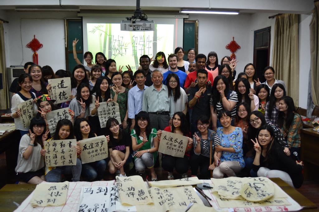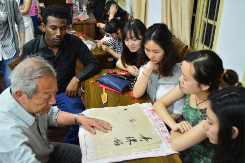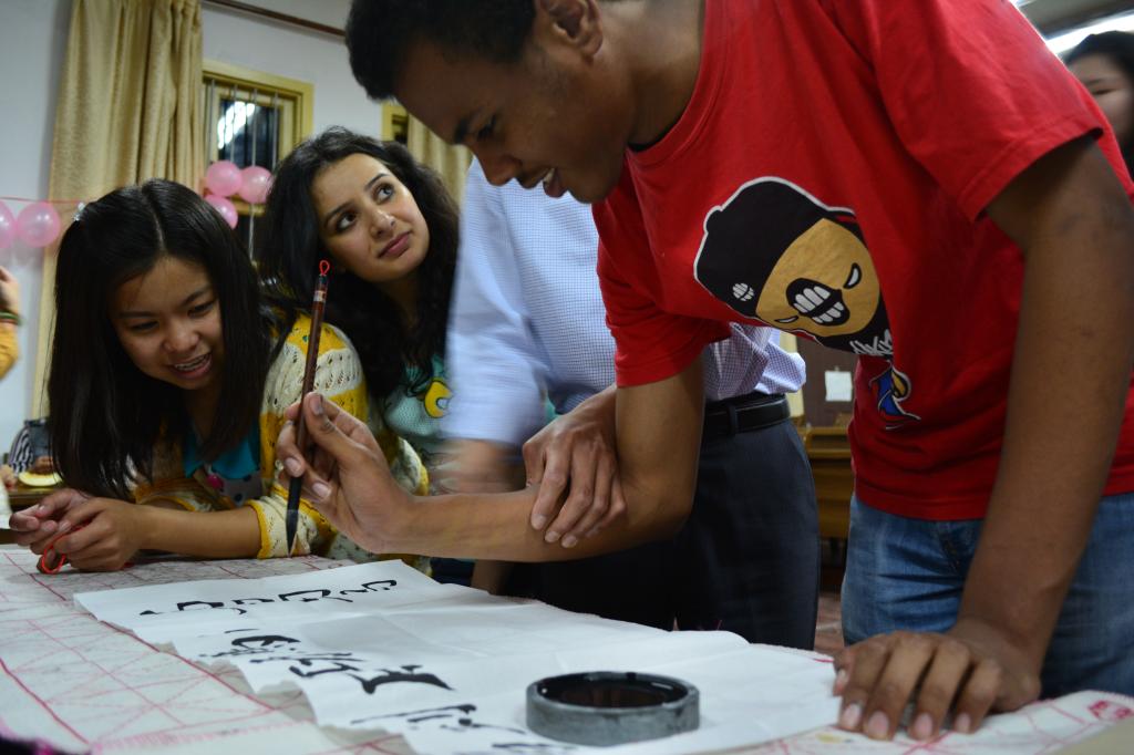 作为中国文化的一部分,中国结以其独特的魅力吸引着来自世界各地的留学生们。汉语班的同学们自觉分成几个小组,每组邀请两位留学生加入共同编织中国结。在大家的商讨下,汉语班同学决定教给留学生两种中国结——“万字结”和“万花结”。在教会留学生这两种中国结的编法后,一些女同学更是突发奇想用红线编起了手镯、饰品等装饰品。一个个大方美丽的中国结带着满满的喜悦,为到场的师生送去了由衷的祝福。在书法环节中,汉语班同学将三个大桌子移到报告厅中央,我院班吉庆老师和李现乐老师执笔挥毫让留学生们真正领略中国书法文化的魅力,留学生们也亲自动笔,在老师的指导下学写毛笔字。应留学生们要求,李老师为他们书写了多幅励志小条幅,班老师则赠送给留学生“友谊地久天长”、“友谊万岁”等书法作品,现场气氛异常火爆。