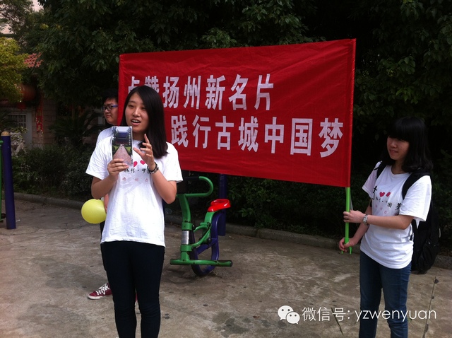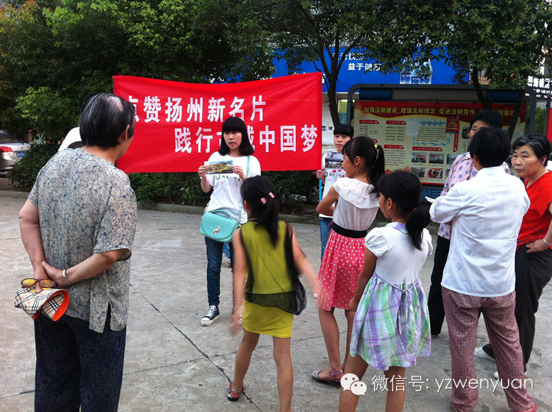 经过前一阶段对扬州古城文化景点的实地考察,7月9日,扬大文学院“古城情·中国梦”暑期实践团队走进虹桥社区,开始为期三天的“扬城新名片,宣传进社区”活动。活动重点向扬州市民宣传阮元故居、双峰云栈、南河下老街、宋夹城体育公园等扬州新名片,介绍其文化内涵,增强本地人对扬州新名片的了解,提高新名片的知名度。