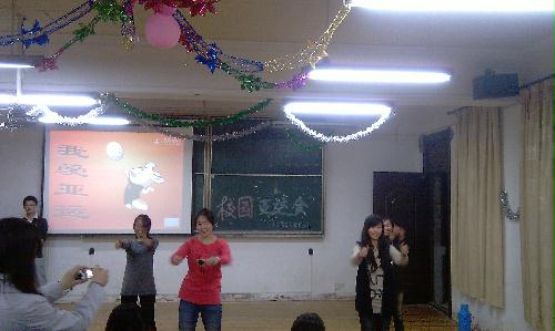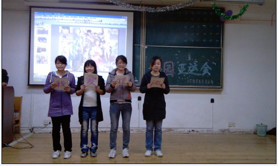 2、活动具体展开:活动一开始先有主持人介绍有关于广州亚运会的相关信息。紧接着就进入了第一个环节——我爱亚运。每组选手以各种方式来表达自己对亚运会的支持。接下来就是第二环节——亚运拼盘。同学们既动脑又活动身体。每组分别由两个人“运输”物品,两个人制作拼盘。经过了游戏规则的各项难关,每组都制作出了各有特色的水果拼盘。最后一个环节——亚运竞猜。每组派出两个人站在报纸上进行答题。答错则脚下的报纸就会少二分之一。这一环节同学们玩的非常尽兴。看着脚下的报纸越来越少,无论什么样的办法,只要能站在那上面,都会用上。有提脚的,有脱鞋的,有相抱的等等。活动在欢笑声中步入尾声。