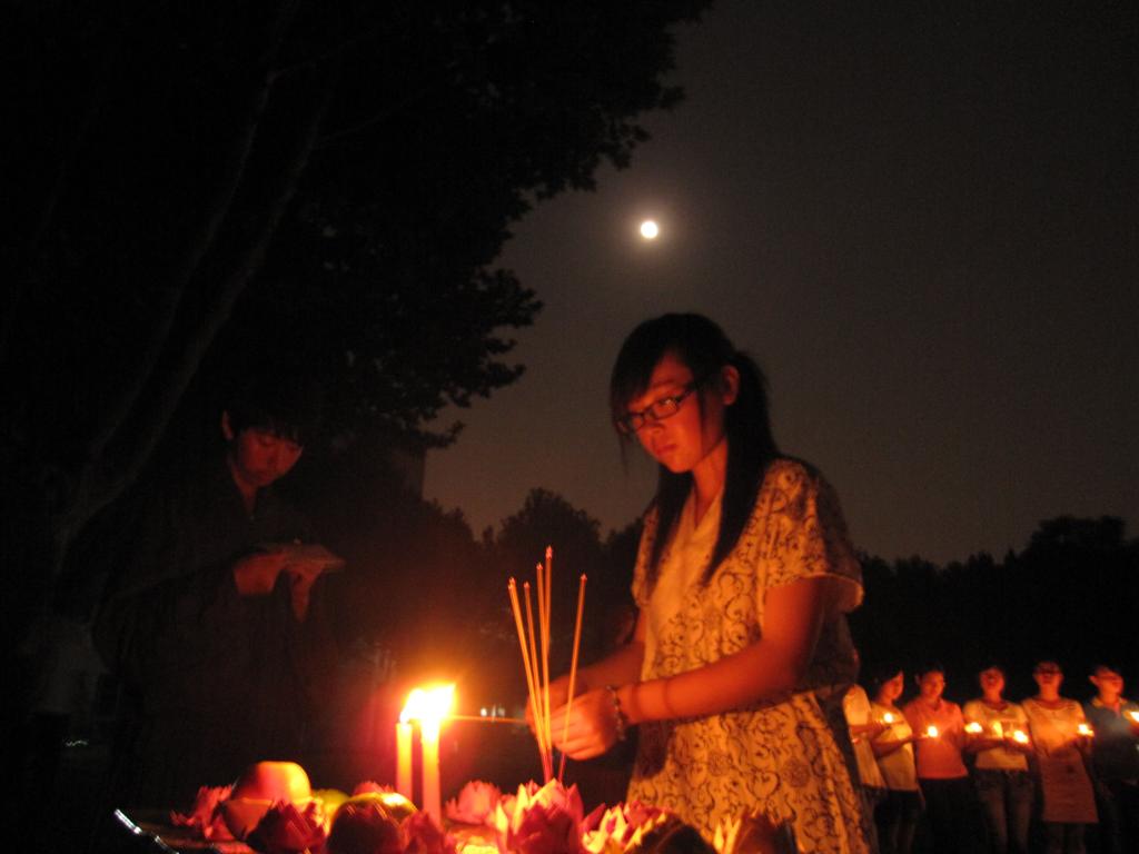 9月21日晚,扬州大学文学院学子举行“祭月”活动。三十名大一新生围成半圆形,三个学生沐浴后身穿汉服开始祭月,上香、祭酒、读祝,表达自己对故乡和亲人的思念之情。(董鑫 蒋小莹)
