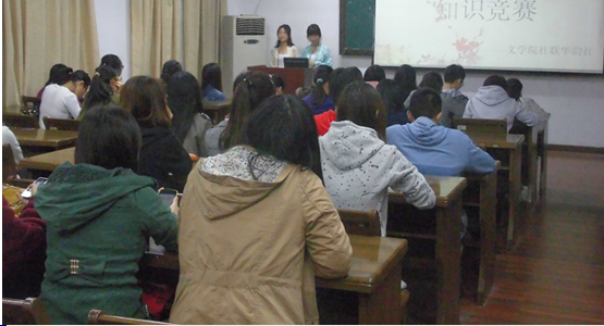 2013年11月2日周六,文学院华韵社在团委报告厅举办了极具特色的“传统文化知识竞赛”活动。本次活动请到了社联副主席孙艳和张羽佳,社会发展学院平山印社社长郑鹏程,春秋史学社副社长陈炳焰担任评委。据活动负责人透露,本次活动特地在题目中增加了关于汉服的知识,旨在增强同学们对传统文化知识的同时,适当普及汉服知识,展中华之神韵,扬民族之风华。