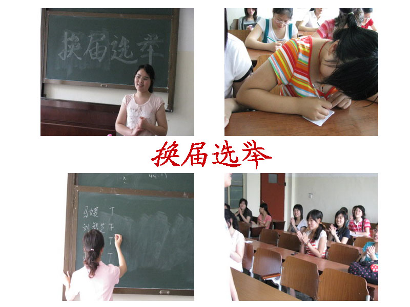 学期终了,一年的工作完成,为保证下一年工作的顺利展开,要确定下一届社团负责人。秉着院党委、团委提出的公正、公平、公开的原则,我们在最后一次例会上进行了社团换届选举。综合考虑投票结果以及个人意愿因素,我们选出了社团下一届接班人。