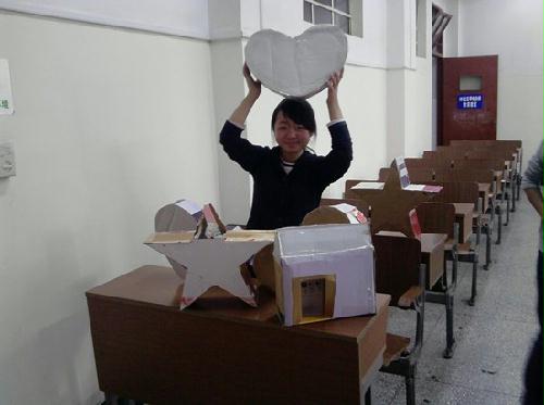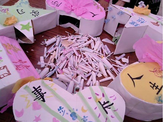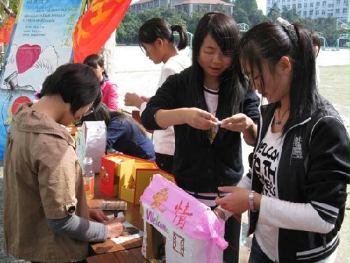 2.活动内容:将六个盒子摆好,参加活动的同学们在我们准备的小纸条上写下自己的心愿,我们帮他们用红丝带绑好放在心愿盒子中,然后他们可以选择一个主题,抽出盒子里的祝福纸条。对于同学们的心愿,本打算放在瓶子中进行漂流,但是考虑到环境问题,我们打算放在瓶子中,然后埋在土里,让大自然保存这些美好的心愿。