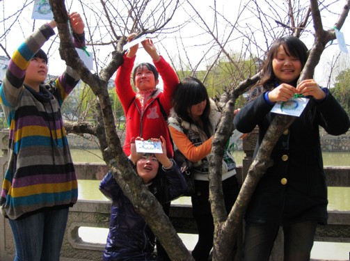 当天中午,太阳高照,运河畔的桃树柳树也纷纷抽出新芽。汉协的成员们亲手用绿丝带给树木系上带有诸如“让黄河之水源源不断,让母亲乳汁永不干涸”以及“树木拥有绿色,地球才有脉搏”等字样的卡片。与此同时,同样在运河边进行环保活动的扬州市田家炳实验中学的学生们也加入了汉协成员们的行列,寄托他们的美好期望。