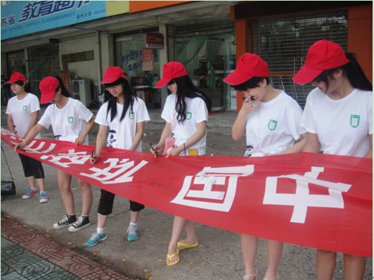 2013年7月6日,在扬州大学瘦西湖校区出现了一群头戴红帽,身着白色T恤的学生。他们是扬州大学文学院“光盘行动”暑期实践小组的队员们。他们手拿亲手制作的内容为“绿色中国低碳出游”横幅在教育超市门口号召扬大学子签名宣誓。