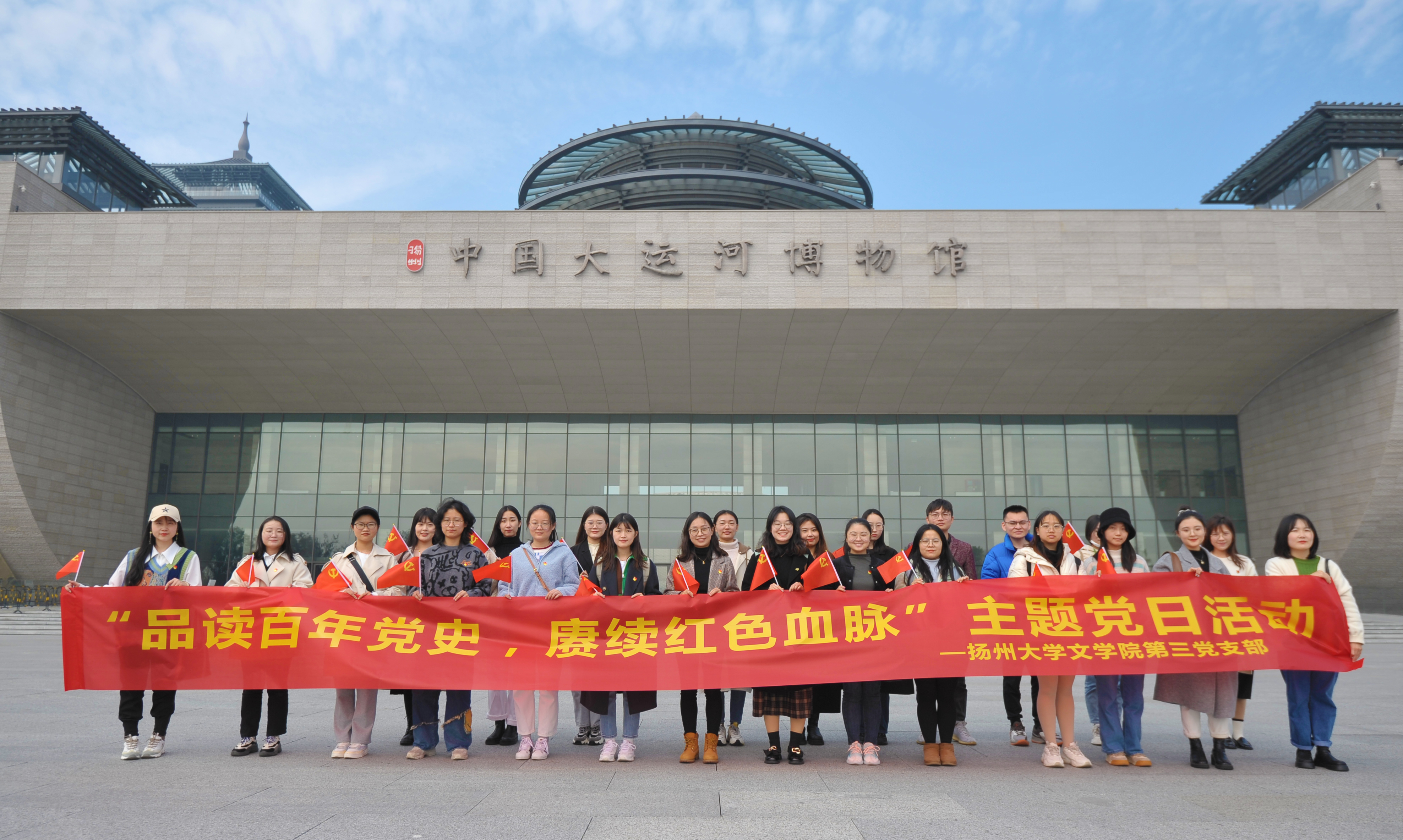 10月16日,中国共产党召开了第二十次全国代表大会,其报告主题内涵丰富、意蕴深邃,学习贯彻党的二十大精神是全党全国的首要政治任务。为深入学习贯彻习近平总书记关于用好红色资源、赓续红色血脉的系列重要论述,增强支部凝聚力,扬州大学文学院研究生第三党支部于2022年11月16日在支部书记赵彦婕老师和支委的组织下前往扬州市中国大运河博物馆、扬州市档案馆开展了以“品读百年党史,赓续红色血脉”为主题的党日活动。