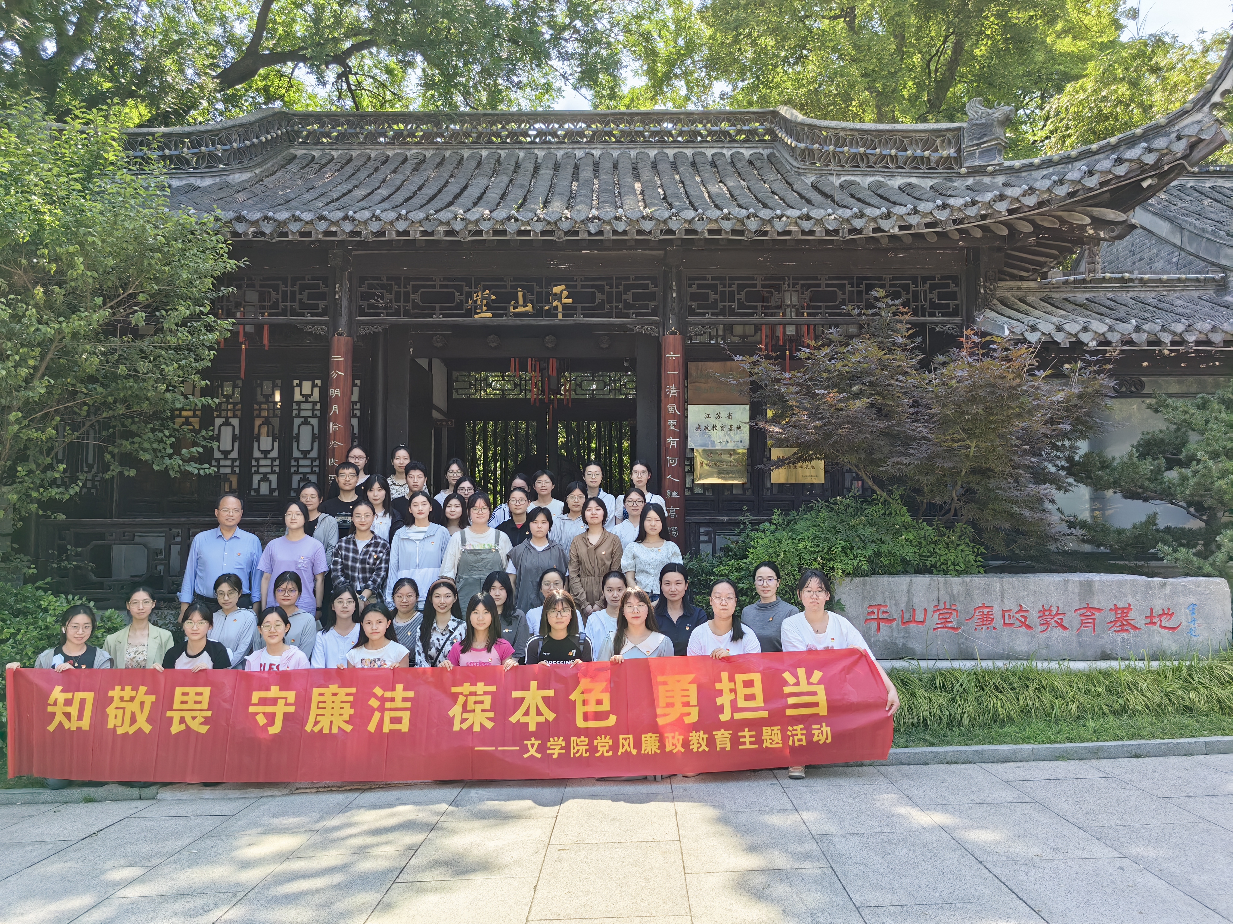 6月9日,文学院党委组织全体预备党员赴平山堂廉政教育基地现场开展“知敬畏,守廉洁,葆本色,勇担当”主题教育活动。院党委副书记张茜开展现场微党课教学,要求大学生端正入党动机,争做合格党员。同时强调,要养成敬廉崇洁的思想作风、求真务实的学习作风、遵纪守法的组织作风、艰苦朴素的生活作风,以实际行动肩负时代重任,锲而不舍、接续奋斗,展现新时代的青春担当。
