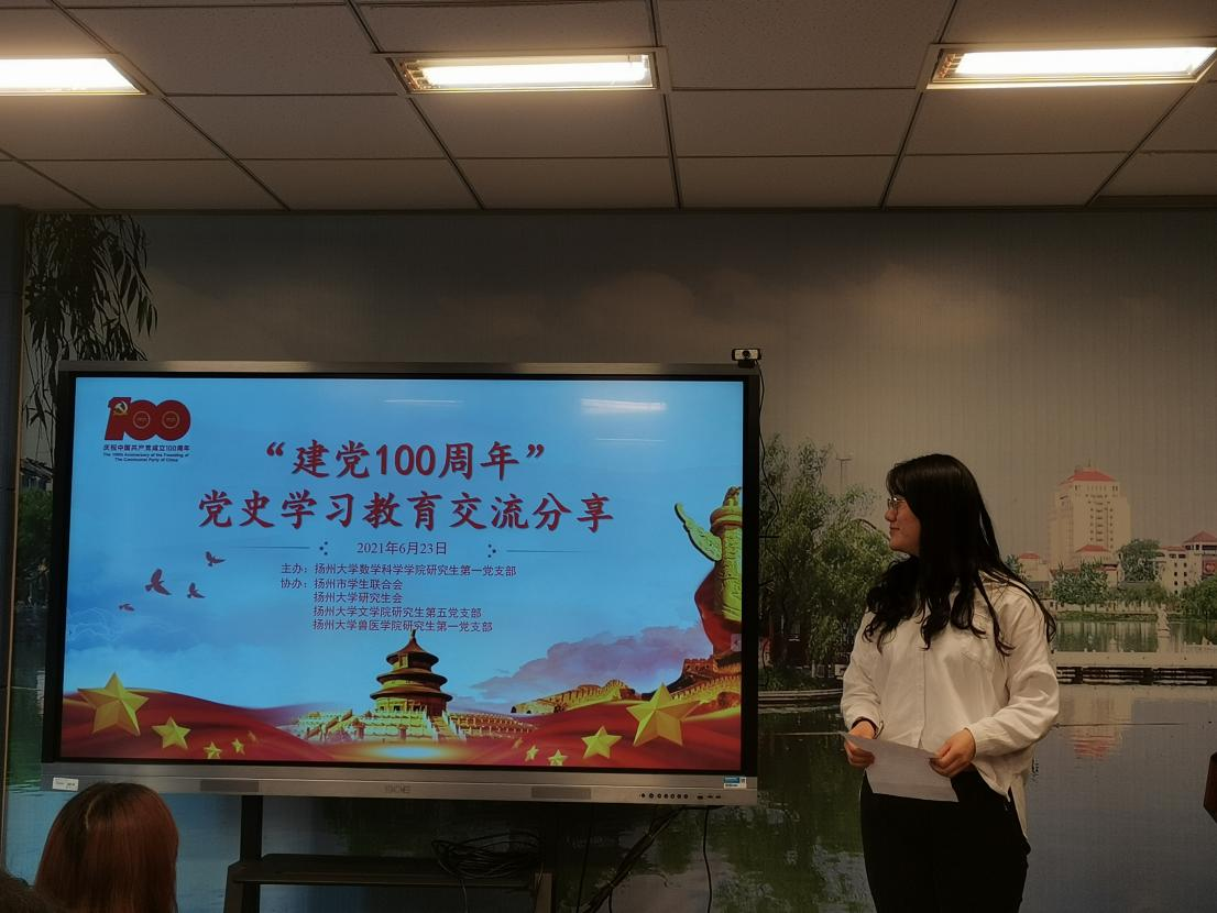 参访完扬州市革命烈士陵园后,文学院研究生第五党支部党员前往瘦西湖校区,开展“建党100周年”党史学习教育交流分享会。在会上,支部委员陈志楠做了学习交流分享,“要创新党史学习教育形式,交流促分享,互相学习,创新党史学习教育形式,助力党史学习深人人心,赓续使命强化担当!”