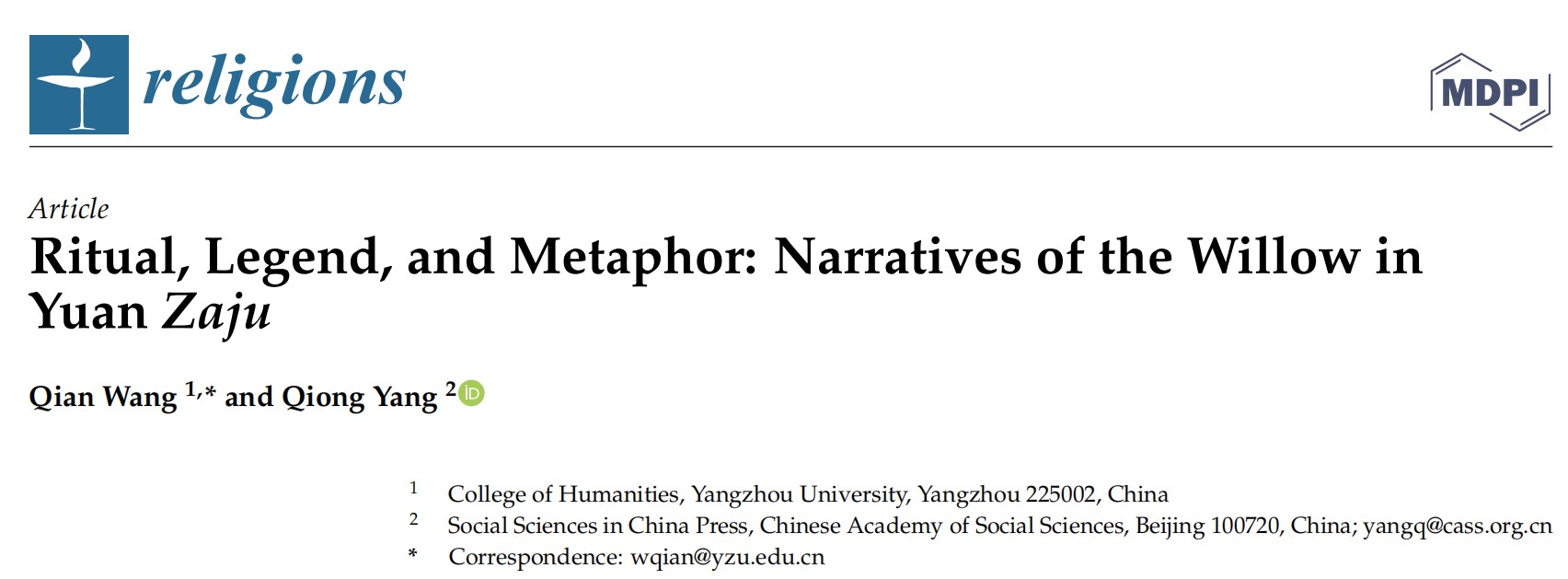 《Religions》2022年第一期刊发我院王倩老师论文《Ritual, Legend, and Metaphor:Narratives of the Willow in Yuan Zaju》。《Religions》为Web of Science的Arts & Humanities Citation Index所收录,排名英文宗教类杂志第一。