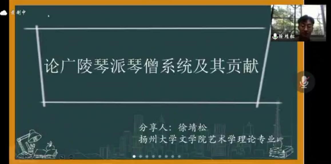 我院艺术学理论专业硕士研究生徐靖松同学代表古琴学社参与了本次琴学论坛,其分享的题目是《浅谈广陵琴派之琴僧系统及其贡献》,分三个部分系统阐述了“琴”与“僧”之关系渊源、广陵谱系中的琴僧系统以及琴僧系统于广陵琴学之意义,采用的论述方法多样,观点新颖,展现了扎实的文献功底。