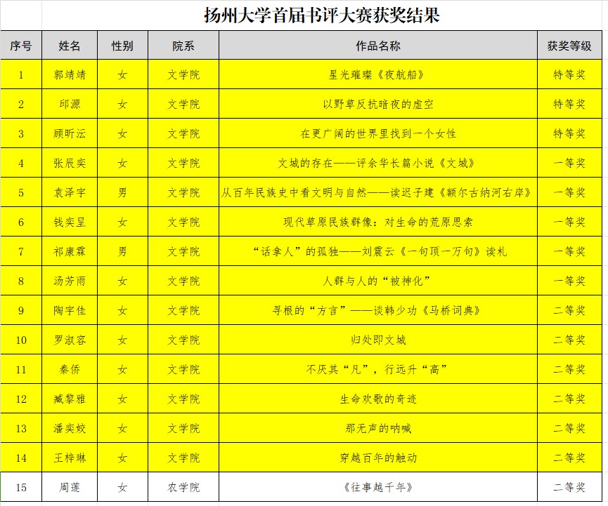 近日,学校公布扬州大学首届书评大赛获奖结果,我院荣获特等奖3项,一等奖5项,二等奖6项。