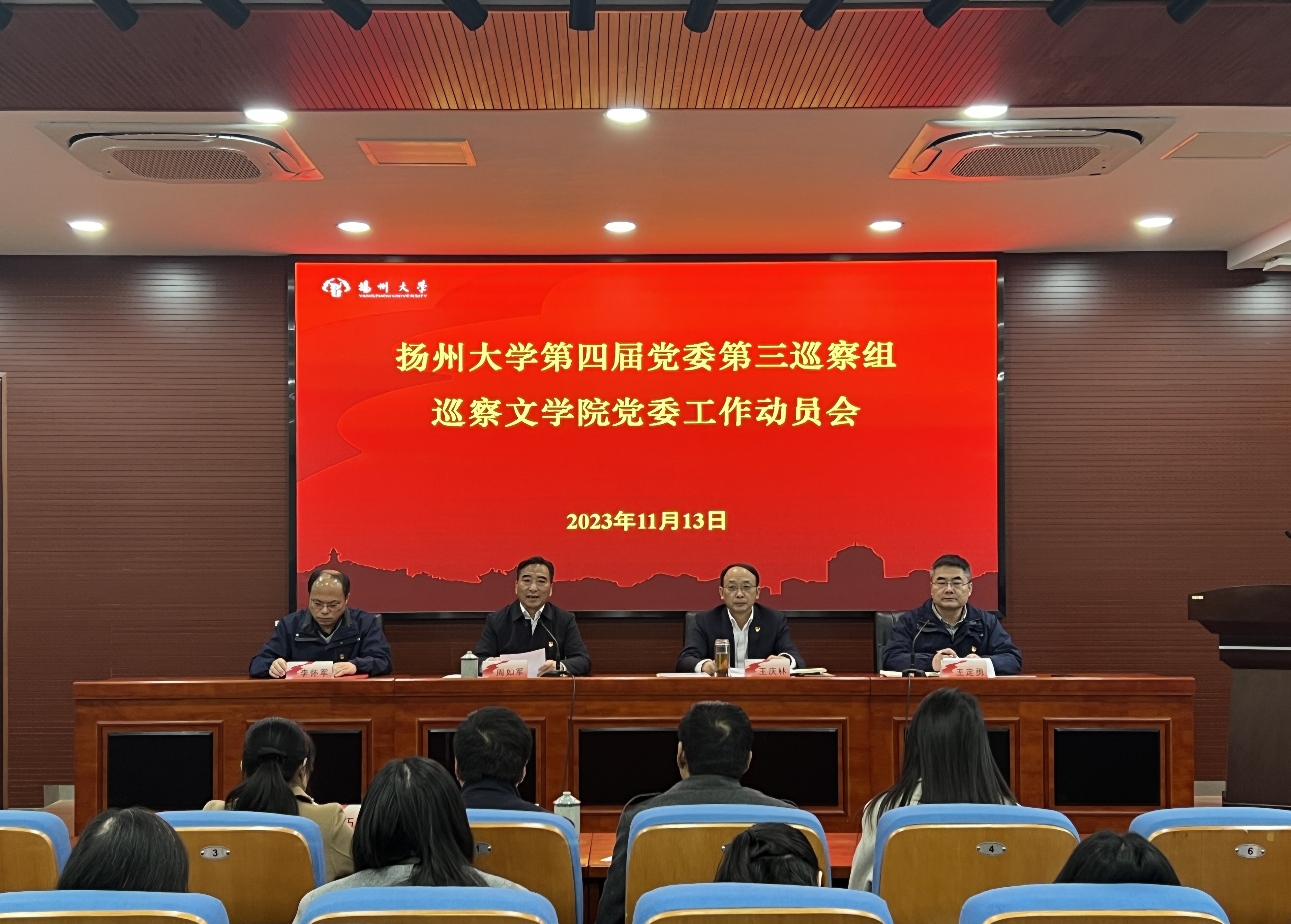 11月13日下午,校第四届党委第三巡察组巡察文学院党委工作动员会在瘦西湖校区文科楼中敏报告厅召开。校第四届党委第三巡察组成员、文学院全体领导班子成员、科级干部、民主党派教师代表、专业负责人、教研室主任、党支部书记、师生代表等参加本次会议。