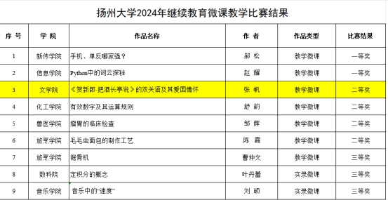 近日,学校公布了扬州大学2024年继续教育微课教学比赛结果。经学院审核推荐、学校专家评审,共评选出一等奖2项,二等奖4项,三等奖3项。我院张帆老师的作品《〈贺新郎·把酒长亭说〉的双关语及其爱国情怀》荣获二等奖。