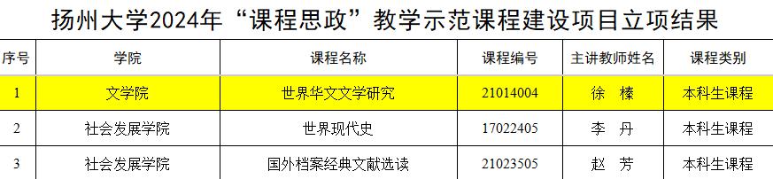 近日,学校公布了2024年课程思政教学示范课程建设项目立项结果,我院徐榛老师的《世界华文文学研究》获立项建设。