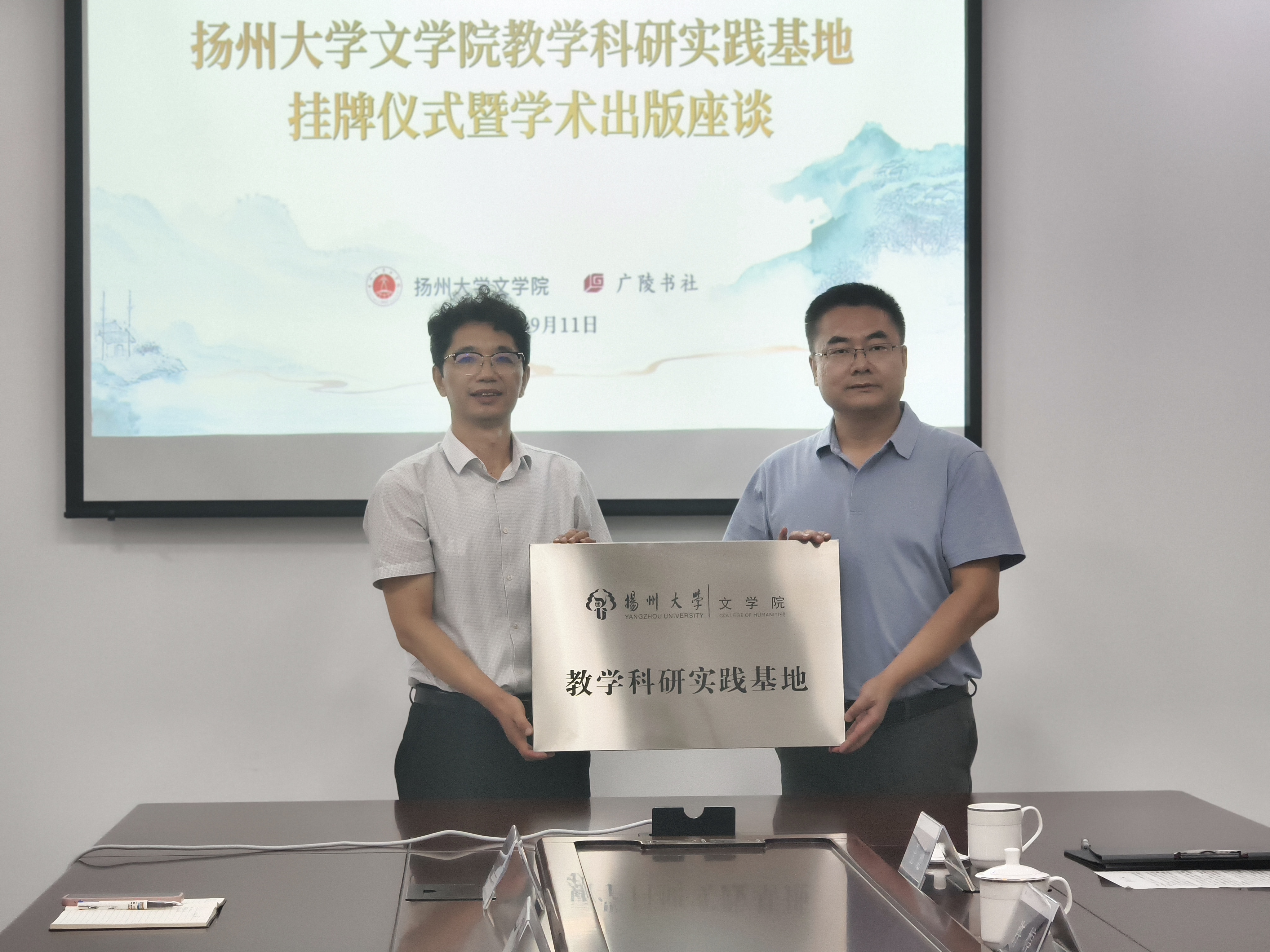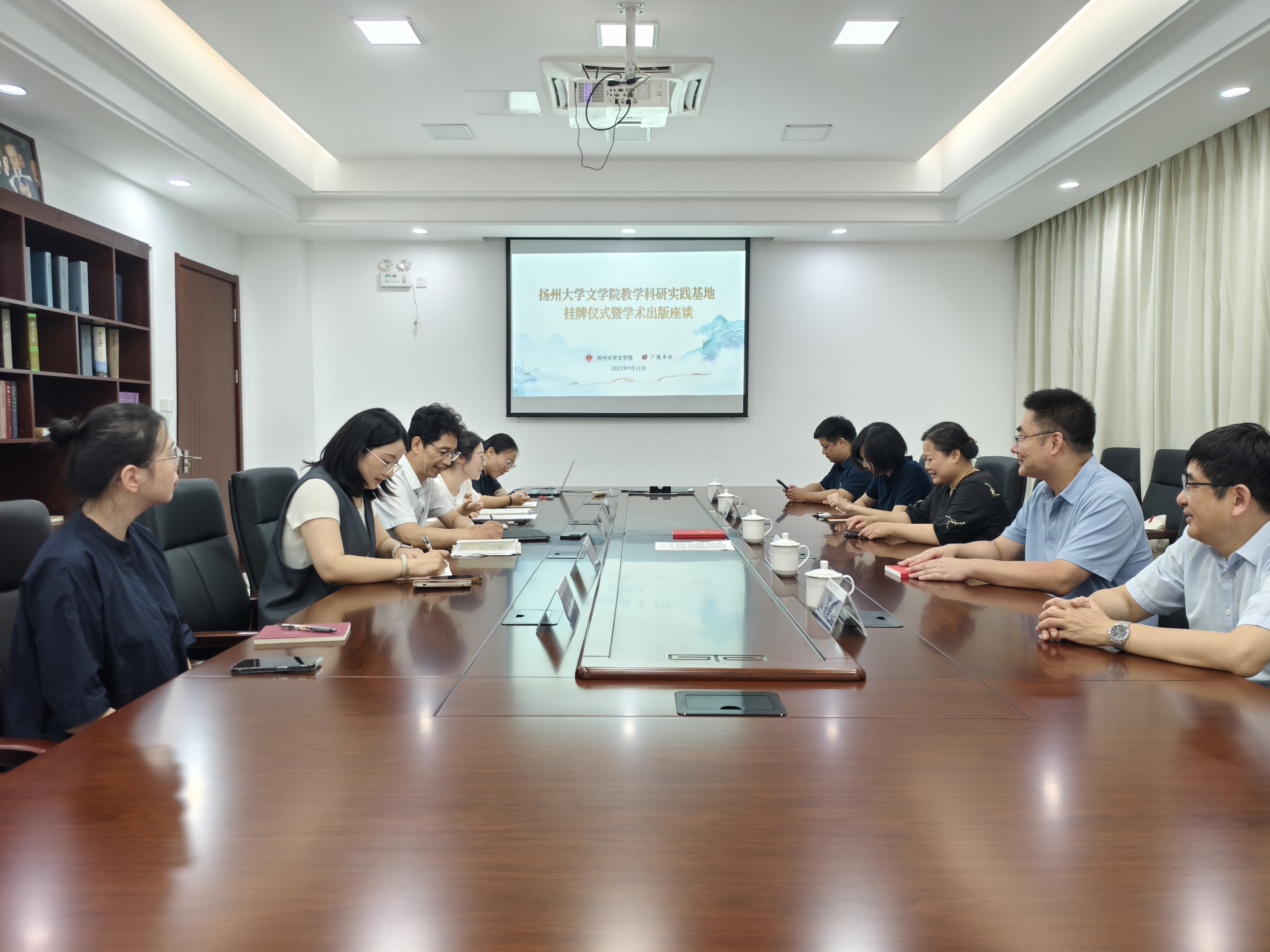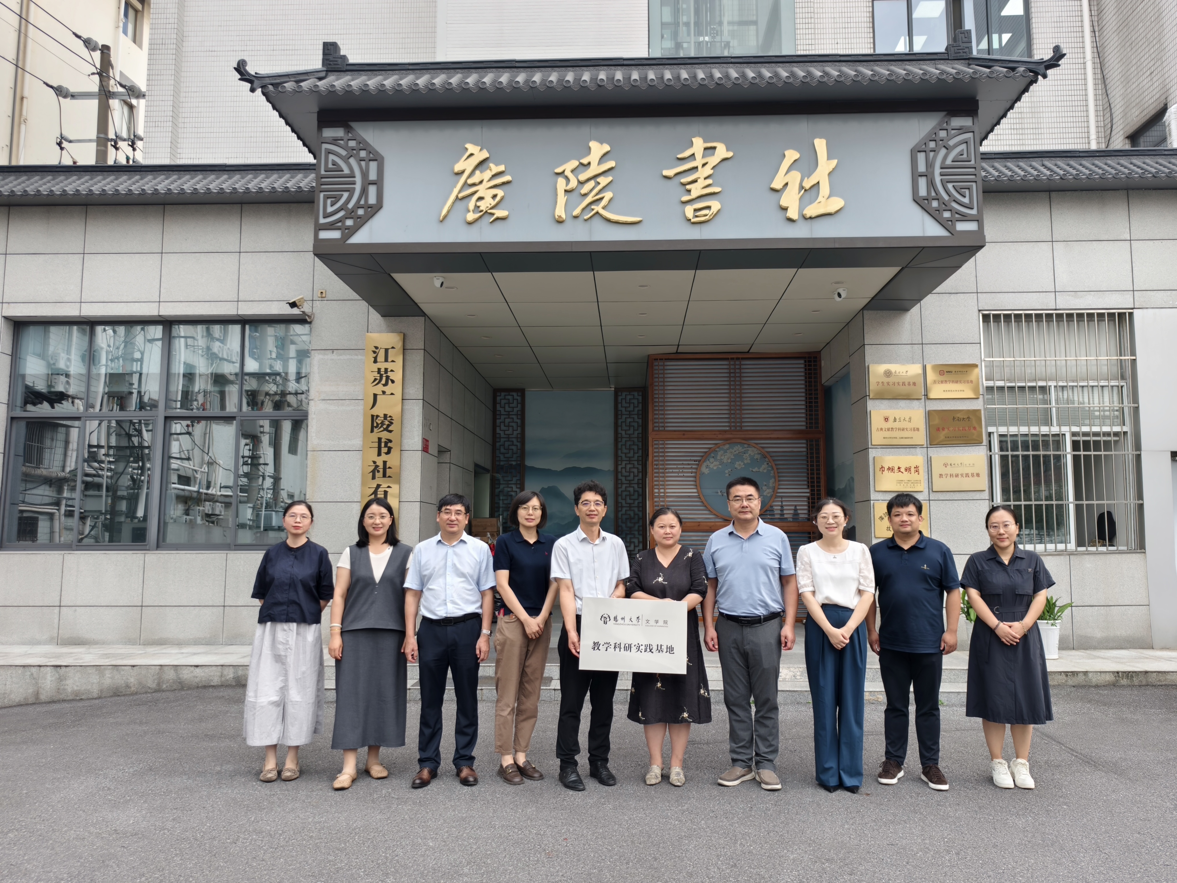 9月11日下午,我院教学科研实践基地挂牌仪式暨学术座谈会于广陵书社圆满举行。院党委书记郭丽、院长王定勇、党委副书记许婷、副院长张堂会、副院长王逊,与广陵书社社长刘栋、副总编辑方慧君、总编办主任金晶、扬州地方文化编辑中心主任王丽、古籍学术编辑中心主任李佩等一同出席此次活动。座谈会由广陵书社副总编辑方慧君主持。