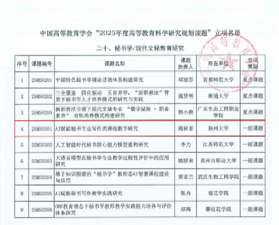 近日,中国高等教育学会公布了“2025年高等教育科学研究规划课题”立项名单,我院施秋香副教授主持的“AI赋能秘书专业写作类课程教学研究”获批立项。