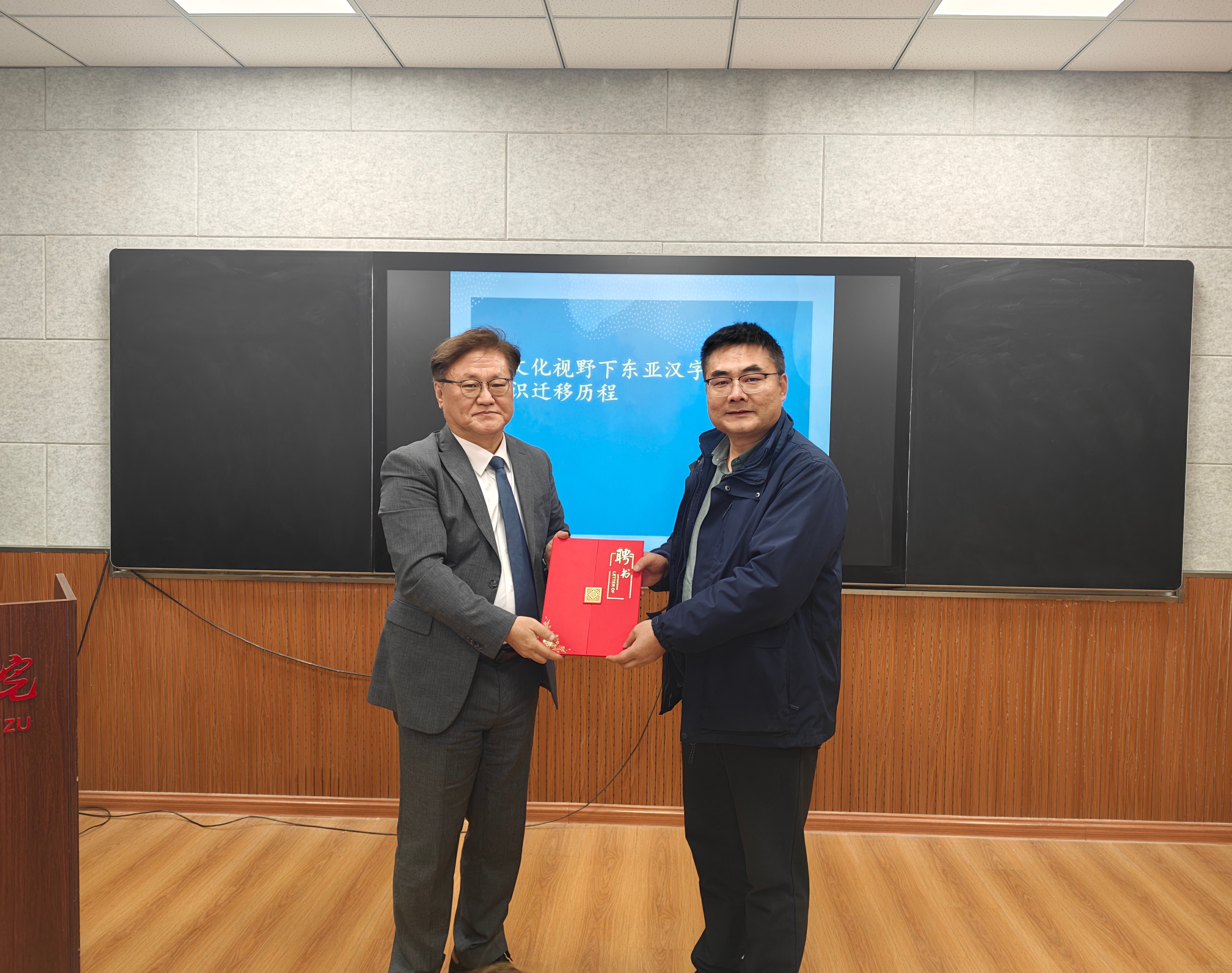 12月2日下午,韩国釜山大学许喆教授受聘我院特聘教授并做了题为《跨文化视角下东亚汉字文化圈知识迁移历程》的学术讲座。受聘仪式与讲座由郭院林教授主持,王定勇院长颁发特聘教授证书。