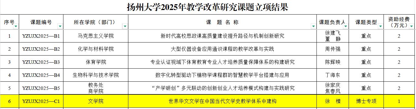 近日,学校公布了2025年校教学改革研究课题立项结果,我院徐榛老师主持的“世界华文文学在中国当代文学史教学体系中的建构”立项博士专项课题。