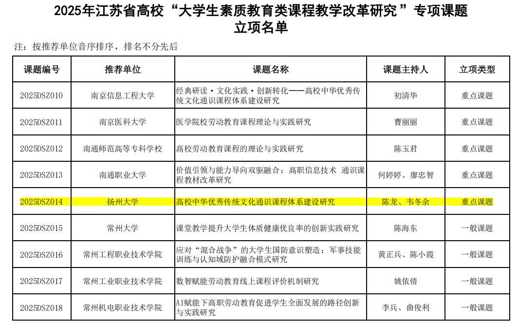 近日,江苏省高等教育学会公布了2025年江苏省高校“大学生素质教育类课程教学改革研究”专项课题立项名单。我院陈龙老师主持的《高校中华优秀传统文化通识课程体系建设研究》立项重点课题。