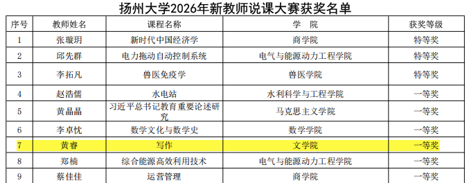 近日,学校公布了2026年新教师说课大赛比赛结果,经学校初审、网络评审和现场比赛评审,大赛产生特等奖3项、一等奖6项、二等奖12项。我院黄睿老师荣获一等奖。