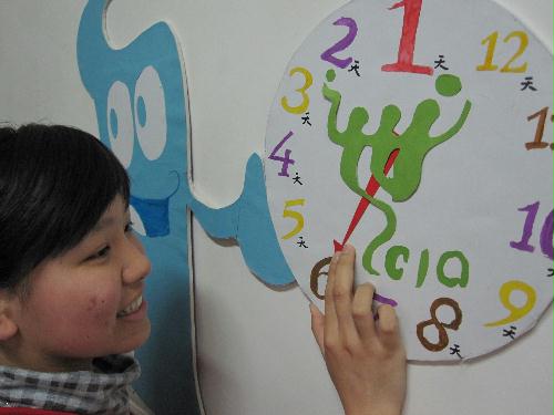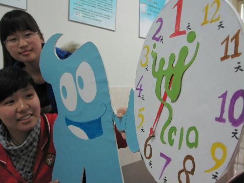 4月25日,距离上海世博会开幕还有6天。扬州大学文学院的学生们用平时生活中积累的废纸、废泡沫塑料自制了一个世博会环保倒计时牌,响应了“绿色世博”的主题,并以此来表达大学生们对上海世博会成功召开的美好祝愿。 (狄维 蒋小莹 摄)