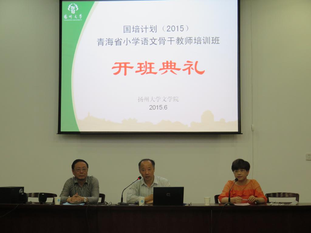 国培计划(2015)青海省小学语文骨干教师培训班开班 6月5日,受青海省教育厅委托,“国培计划(2015)青海省小学语文骨干教师培训班”在文学院开班。扬州大学文学院党委书记胡学春副教授、本次培训首席专家徐林祥教授等出席开班典礼并分别致辞。开班典礼由扬州大学文学院党委副书记刘佳博士主持。