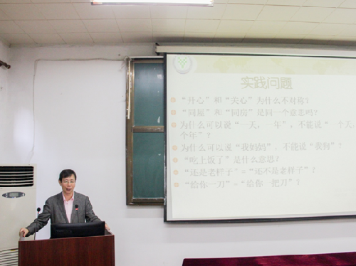 随后,崔教授结合教学过程中所遇到的诸多有趣的现象,讲解了如何发现语言研究的问题,包括理论问题和实践问题。如:为什么日本人说“我肚子疼”中的“肚子”听起来却像“兔子”?“开心”和“关心”为何不对称?“偏不说”和“偏偏不说”有无不同?崔教授所举的具体实例涵盖语音、词汇、语法、篇章、汉字、语用等不同层面,非常之生动有趣,引起了同学们的阵阵欢笑。笑声之后,崔教授严肃地指出,问题都是小问题,但是这些小问题背后却都隐藏着大问题。这就需要我们在今后的汉语教学过程中积极发现有价值的问题,多做思考,再通过研究为汉语本体研究以及汉语国际教育事业做出理论上的扩充和自己的贡献。