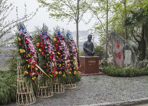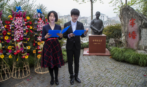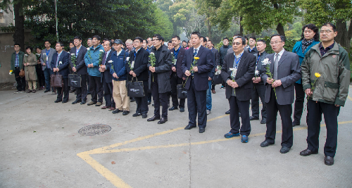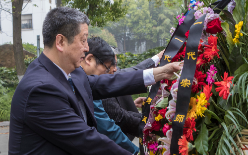 8号上午,与会学者首先来到扬州大学瘦西湖校区,来到任先生曾经生活、工作过的地方,为他的塑像献上花篮。扬大文学院的学生朗读了由其弟子李昌集教授所撰写的《祭任中敏先生文》,所有学者对先生塑像和半塘纪念碑鞠躬献花,以表达深深的敬意和怀念。整个纪念仪式由文学院院长陈军教授主持。