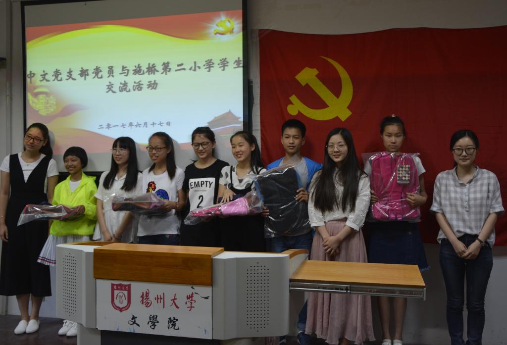 会后,20名中文支部的党员还与施桥镇第二小学的5名小学生代表进行了互动,现场氛围轻松、热烈。活动结束后,学院向小朋友们赠送了书包、课外书等学习用品,鼓励他们热爱读书,主动学习。