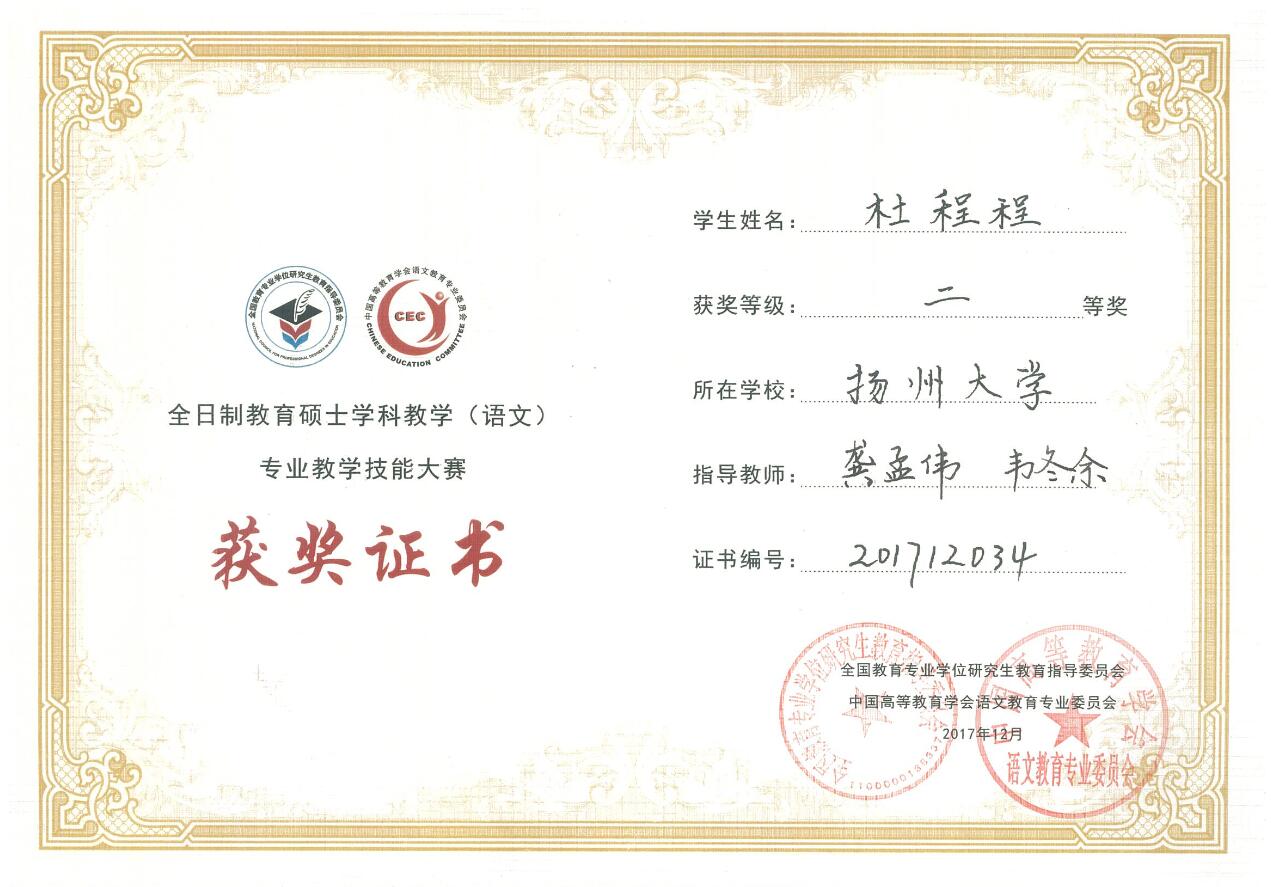 2017 年 12 月 6 日至 9 日,“第二届全日制教育硕士学科教学(语文)专业教学技能大赛”决赛在云南省玉溪师范学院举行,我院龚孟伟老师和韦冬余老师指导的研究生杜程程参赛并获二等奖。