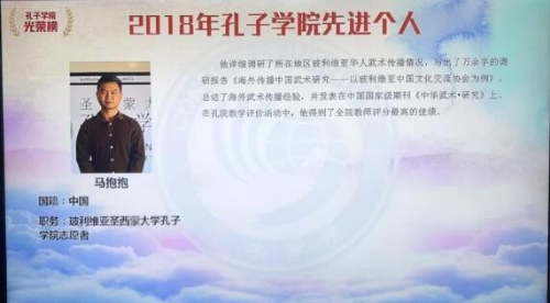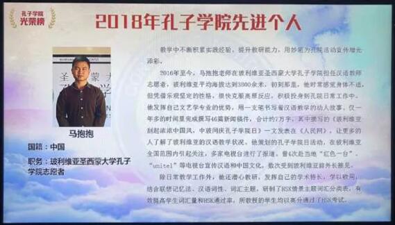 马抱抱,我院文艺学专业在读研究生,2018年出版个人诗集《此情可待》。2016年11月至2018年12月任南美洲玻利维亚圣西蒙大学孔子学院汉语志愿者。两年间,任教的教学点有:中国文化交流协会、美洲学校、深迪学校和孔院本部。马抱抱凭借过硬的专业素质,专注于汉语教学工作,以出色的教学成果两次荣获孔院优秀教师称号。他注重发挥自己的学术特长,学以致用,根据联想记忆法、汉语词性、词汇主题和考试重难点,研制了HSK情景主题词汇分类表,有效提高学生词汇量和HSK通过率,所教授的学生均高分通过HSK考试。他的学生中已有一位在华留学,一位获汉语桥世界大学生中文比赛全国第二,一位获汉语桥世界大学生中文比赛美洲第六,一位获第二届拉美中文歌曲大赛第三。他多次主持孔子学院教研活动,负责本土教师培训。教学工作以外,他还完成了撰写55篇新闻稿件、约7万字的宣传工作。撰写的《玻利维亚刮起浓浓中国风,中玻同庆孔子学院日》一文发表在人民网上。马抱抱充分发挥自身的专业优势,在孔子学院组织6场、参与38场文化活动,2017年还策划了孔子学院院日活动,在玻利维亚全国范围内引起关注,多家电视台进行报道。他撰写的《孔子学院日活动汇编》受到一致好评,4次赴红色一台、unitel等电视台宣传汉语和中国文化,多次受到玻利维亚前外长接见。