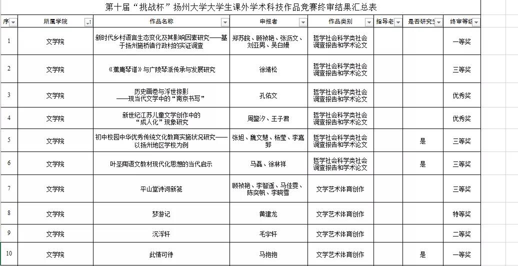 本届挑战杯竞赛,设“挑战杯”一项,“优胜杯”九项,我院喜获“优胜杯”。我院一苇书阁被认定为首批扬州大学“菁扬创新工坊”。黄建龙的《梦游记》获得特等奖,马抱抱的《此情可待》和郑苏皖、顾祯艳、张沥文、刘亚男、吴白嫚的《新时代乡村语言生态变化及其影响因素研究——基于扬州施桥镇行政村的实证调查》获得一等奖,毛宇轩的《沉浮轩》获得二等奖,张旭、魏文慧、杨莹、李嘉郅的《初中校园中华优秀传统文化教育实施状况研究——以扬州地区学校为例》、徐靖松的《< 蕉庵琴谱>与广陵琴派传承与发展研究》、马磊和徐林祥的《叶圣陶语文教材现代化思想的当代启示》、顾祯艳、李智遥、马佳雯、陈奕帆、李晓雪的《平山堂诗词新笺》获得三等奖,周鋆汐、王子君的《新世纪江苏儿童文学创作中的 “成人化”现象研究》和孔佑文《历史画卷与浮世掠影——现当代文学中的“南京书写”》获得优秀奖。