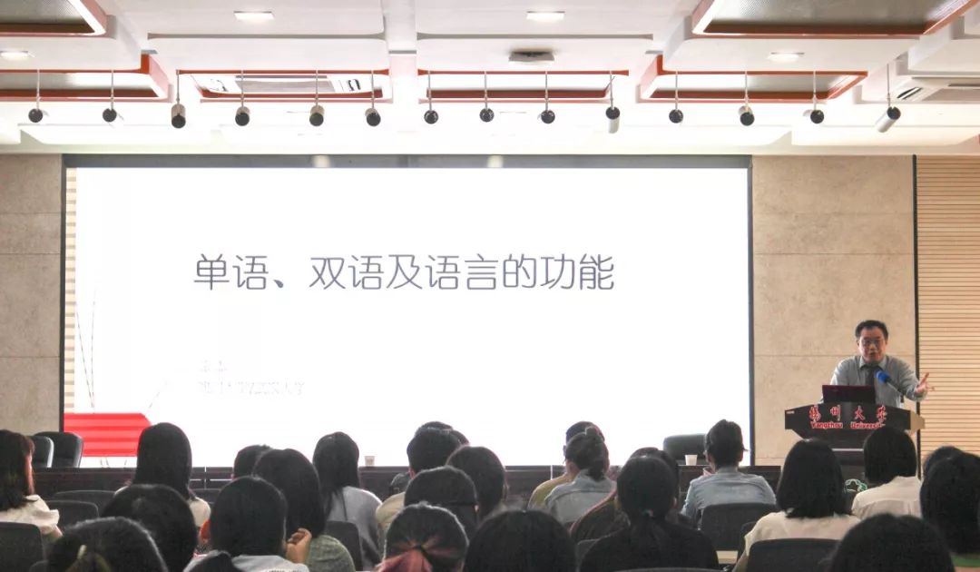 讲座一开始,徐杰教授就提出“在人类众多能力中,语言能力最重要”的观点。如果一个人拥有很强的语言能力,那他在其他方面的能力必定也差不了。语言能力之所以重要,与语言的功能密切相关。语言主要有三大功能,分别是交际工具、思维平台和文化符号,这三个功能相互交织。根据语言使用者对语言的掌握情况,可以分为单语、双语甚至多语。单语是指人在自然状态下习得的语言,一般是母语。双言是国家一体化的结果,而双语是全球一体化的结果,英语成为世界“普通话”就是一个很好的例子。