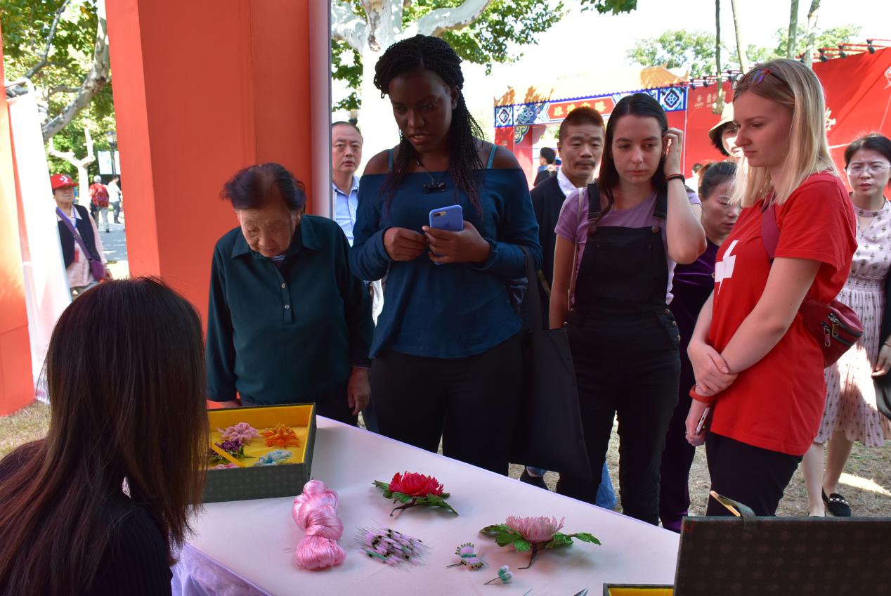 扬州绒花艳而不俗,被誉为工艺品中的“小家碧玉”。在活动现场,留学生们第一次看到形如花鸟鱼虫的绒花簪子,纷纷对这门传统的手艺赞叹不绝。“天子猎场”上,留学生们引弓射箭,豪气干云。在展览区一隅,民间雕刻艺术家所创作的精美竹片雕刻也吸引了许多留学生的目光。