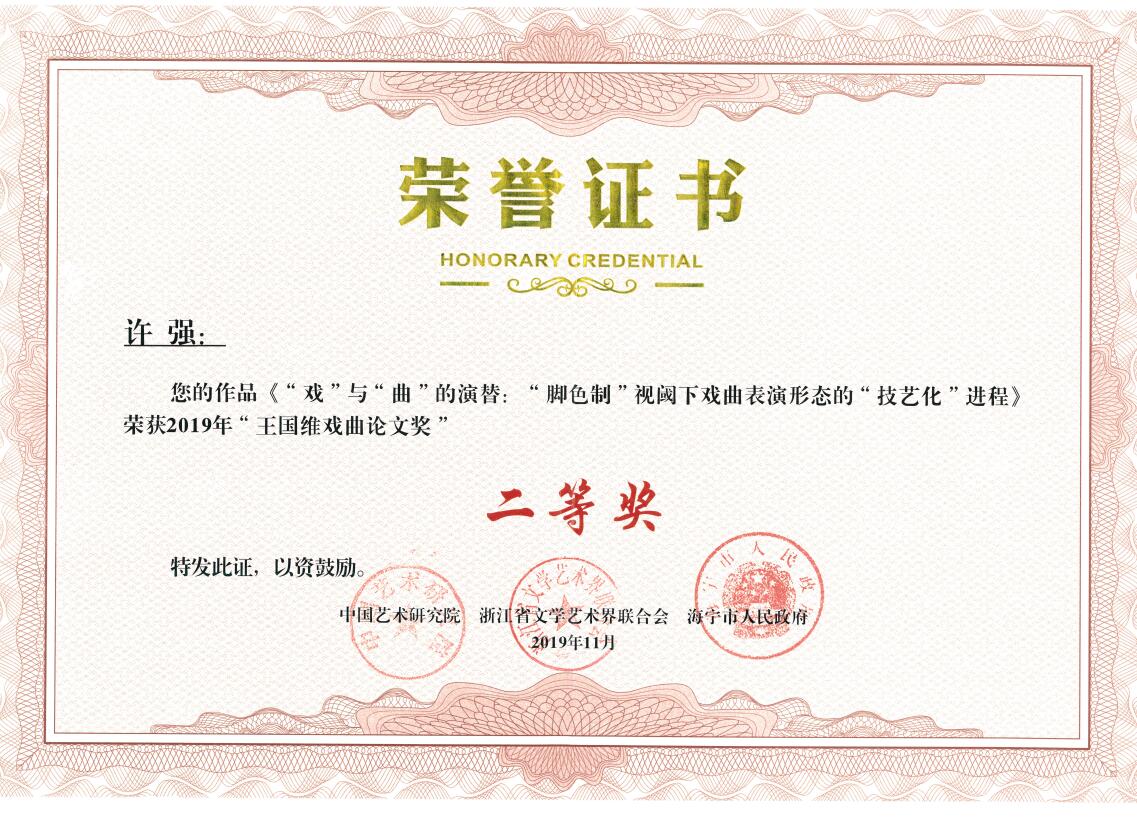 近日,我院18级古代文学博士生许强的作品《“戏”与“曲”的演替:“脚色制”视阈下戏曲表演形态的“技艺化”进程》荣获2019年“王国维戏曲论文奖”二等奖。