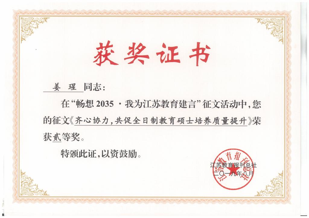 18级学科教学(语文)硕士研究生姜瑆的作品《齐心协力,共促全日制教育硕士培养质量提升》在2019年“畅想2035·我为江苏教育建言”征文活动中,荣获二等奖。