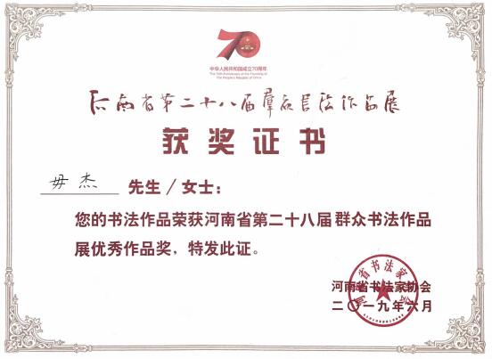 17级艺术学理论硕士研究生毋杰的书法作品在2019年“河南省第二十八届群众书法作品展”中荣获优秀作品奖。