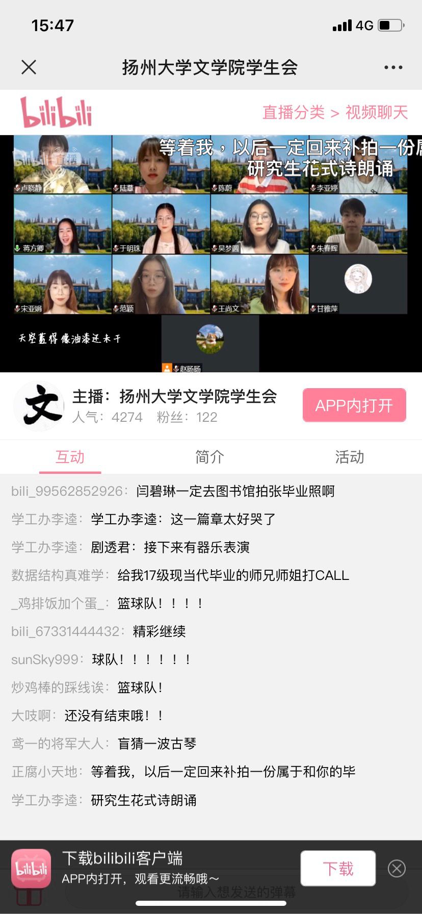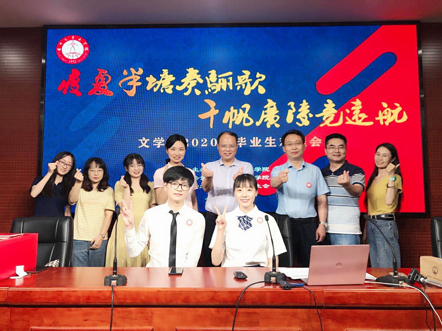 欢送会上,学院师生精心准备“初见”“年华”“远方”三个篇章,音诗画、配音秀、乐器表演、同屏诗朗诵等节目赢得了线上、线下毕业生们的点赞和掌声。