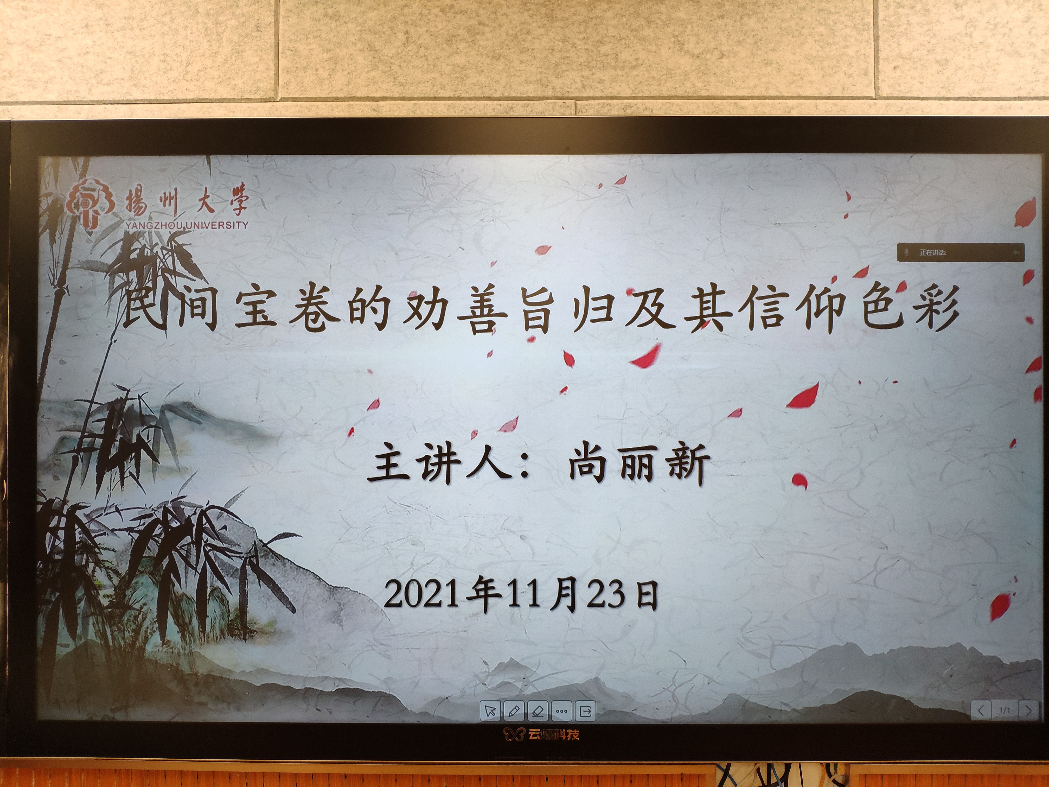 2021年11月23日下午,山西大学文学院尚丽新教授的学术讲座《民间宝卷的劝善旨归及其信仰色彩》在文学院智慧教室举行,讲座通过视频连线进行。