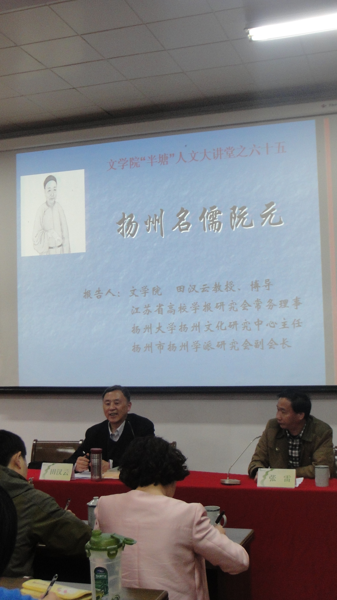 “人是要有点精神的!”田教授这样一句振聋发聩的疾呼一下子让现场陷入了短暂的沉默。“王章涛先生为了编《阮元年谱》,几十年如一日忍着贫寒,也终于让《阮元年谱》成了阮元研究界的权威。扬州学派的研究实际上是从老一辈人就开始了。”田教授回忆了自己一次无意听到别人说“敦煌虽然在中国,但是敦煌学却在日本”的话很受刺激。“扬州学派在扬州,我们也要让扬州文化研究的中心在扬州,这是我们的责任和使命!”田教授的激情也让在场的同学大受鼓舞。最后,田教授意味深长地嘱咐学生们:“早些年,老一辈学者的希望是让我们的研究成果能够‘过江’,现在,我们的研究成果,不仅要‘过江’,还要‘过海’,要传播到更远的地方去,这是增强城市自豪感,增强国家认同感的事儿,是‘中国梦’实现的途径之一。”